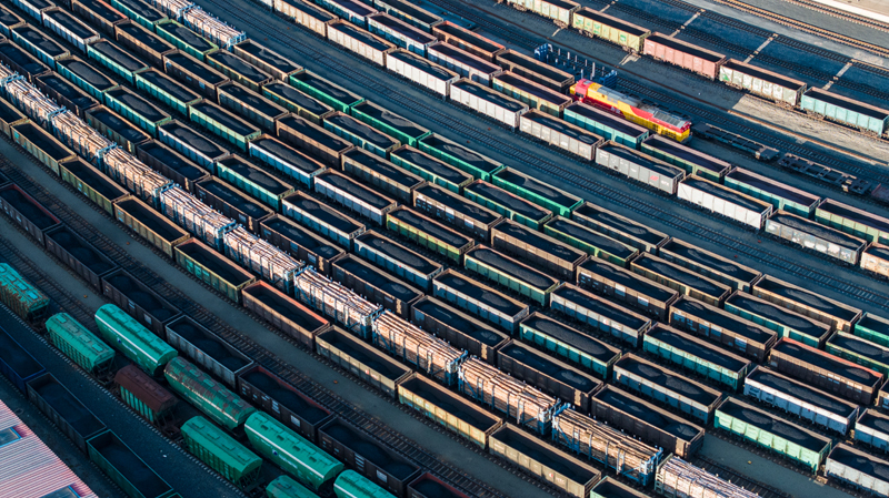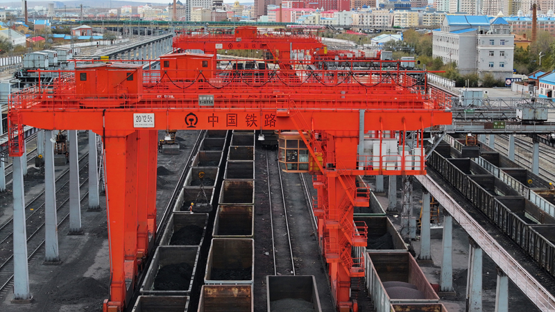 10月18日,在中國鐵路哈爾濱局集團有限公司綏芬河站南場,滿載進口貨物的列車等待解體換裝(無人機照片)。