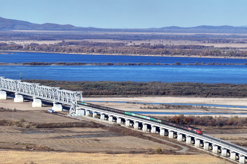 10月16日,滿載進口物資的貨物列車通過同江鐵路大橋駛向中國鐵路哈爾濱局集團有限公司同江北站(無人機照片)。