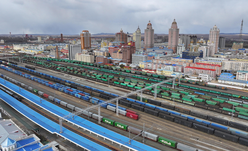 10月18日,在中國鐵路哈爾濱局集團有限公司滿洲里站編組場,中歐班列及進口貨物列車在等待取送車作業(yè)(無人機照片)。