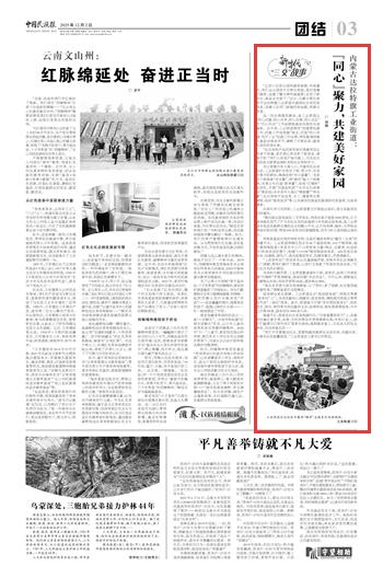 2025年12月2日,《中國民族報》第3版刊發(fā)題為《內(nèi)蒙古達拉特旗工業(yè)街道:“同心”聚力,共建美好家園》的文章,報道了內(nèi)蒙古達拉特旗工業(yè)街道以“同心共建、同心共學、同心共事、同心共樂”的“四心四共”工作法賦能基層治理。打造“同心向暖·花開工業(yè)”民族工作品牌,將民族團結融入基層治理各環(huán)節(jié),奏響了開放包容、融榮共居的和諧樂章。