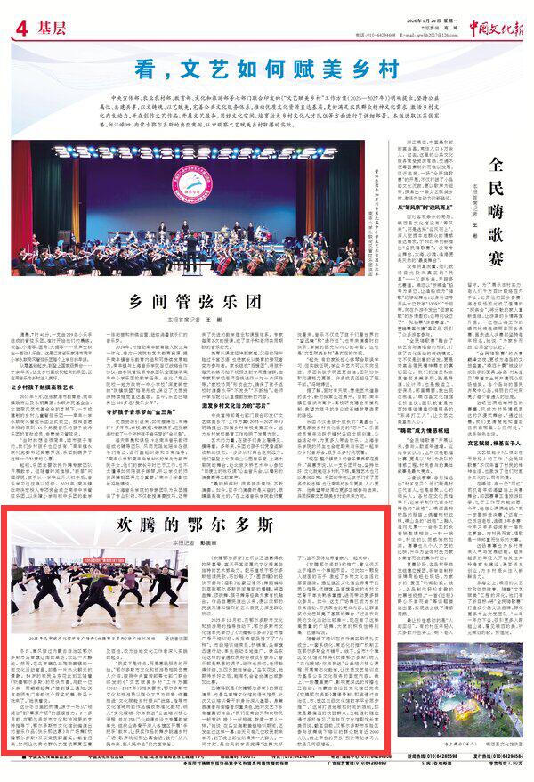 2026年1月26日《中國文化報》第4版刊發(fā)了《歡騰的鄂爾多斯》的文章,報道了廣場舞《歡騰鄂爾多斯》已成為鄉(xiāng)村日常活動、節(jié)慶聚會的亮點內(nèi)容,讓群星獎的光芒照亮了基層的舞臺。作品自惠民演出以來,便以濃郁的民族風(fēng)情和強烈的藝術(shù)表現(xiàn)力深受群眾歡迎。