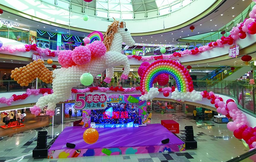 走進(jìn)集寧區(qū)萬達(dá)廣場,一樓東門的跨年倒計時展板格外醒目,“約定,今年要和我愛的人一起跨年”的字樣搭配喜慶的紅色背景,將跨年的儀式感拉滿。商場內(nèi)部的布置巧思盡顯,中庭位置,巨型氣球打造的白色小馬造型栩栩如生,粉色、橙色氣球簇?fù)碜笥?,一旁的彩虹氣球裝飾蜿蜒舒展,與各品牌門前統(tǒng)一的彩色氣球相映成趣,簡約的裝飾搭配讓節(jié)日氛圍愈發(fā)濃郁。