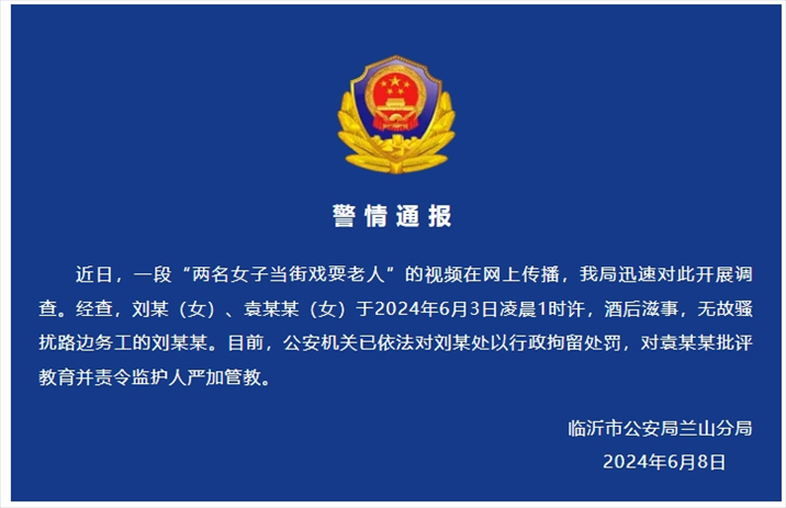 央視網(wǎng)消息:6月8日,臨沂蘭山公安發(fā)布警情通報:近日,一段“兩名女子當街戲耍老人”的視頻在網(wǎng)上傳播,我局迅速對此開展調(diào)查。經(jīng)查,劉某(女)、袁某某(女)于2024年6月3日凌晨1時許,酒后滋事,無故騷擾路邊務工的劉某某。目前,公安機關已依法對劉某處以行政拘留處罰,對袁某某批評教育并責令監(jiān)護人嚴加管教。