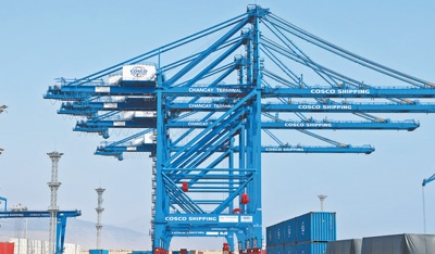 秘魯錢凱港,排列整齊的藍(lán)色岸橋正繁忙運(yùn)作。本報(bào)記者 顏 歡攝