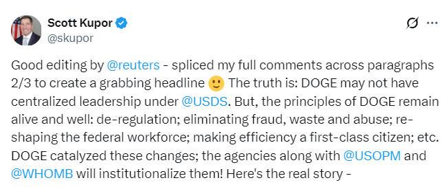 路透社還援引美國人事管理局局長庫珀的消息,稱“政府效率部”已“不存在”,并稱其已不再是一個(gè)“集中式機(jī)構(gòu)”。