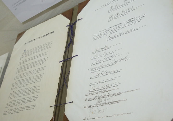 這是2015年9月1日在日本東京外務(wù)省外交史料館內(nèi)拍攝的日本二戰(zhàn)無條件投降書原件。新華社記者 劉天 攝