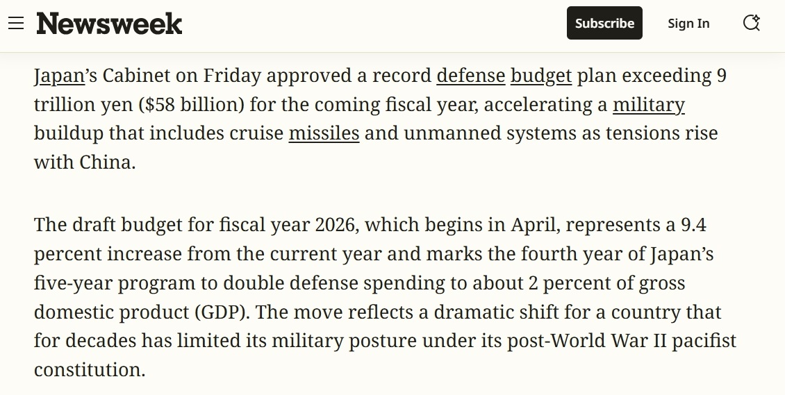 日本政府12月26日批準(zhǔn)2026財年(2026年4月至2027年3月)預(yù)算案,其中防衛(wèi)預(yù)算超9萬億日元,再創(chuàng)歷史新高。其展現(xiàn)出的日本負(fù)面軍事動向,受到國際媒體關(guān)注。