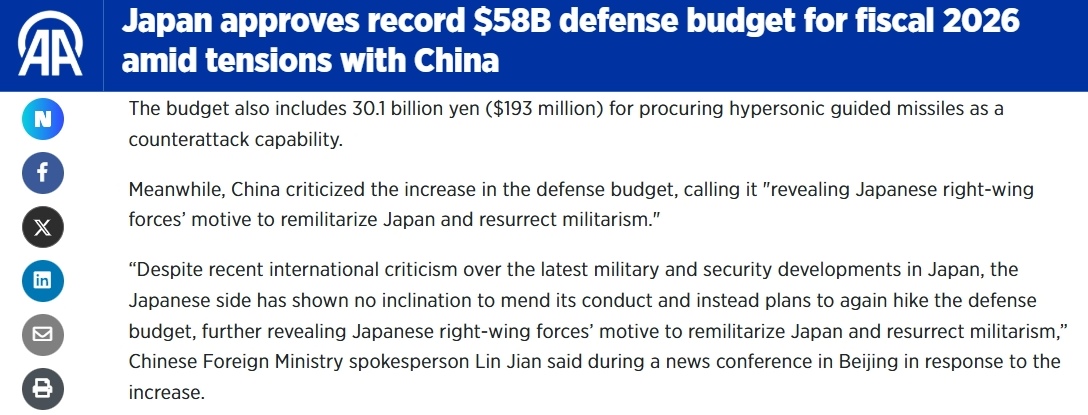 土耳其安納多盧通訊社26日的報道,列舉了日本創(chuàng)紀(jì)錄防衛(wèi)預(yù)算中涉及的方面,例如無人機(jī)、高超音速導(dǎo)彈和航空宇宙自衛(wèi)隊等。同時,報道引述中方的批評稱,“近期國際社會對日本的軍事安全動向,批評聲音不斷,日方不但沒有反省收斂,反而計劃再次大幅增加防衛(wèi)預(yù)算,更加暴露出日本右翼勢力推動日本‘再軍事化’、企圖讓軍國主義死灰復(fù)燃的險惡用心?!?/p>