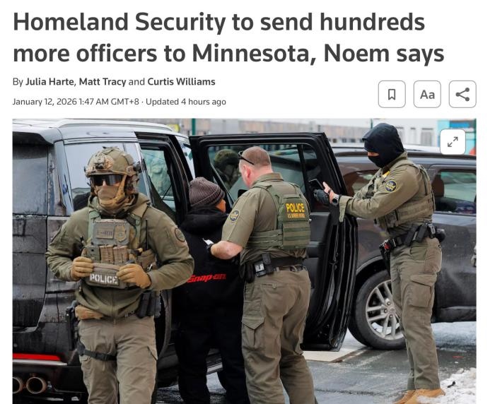 中新網(wǎng)1月12日電 綜合路透社等外媒報道,當(dāng)?shù)貢r間11日,美國國土安全部部長諾姆表示,國土安全部將向明尼蘇達(dá)州增派“數(shù)百名”警員。