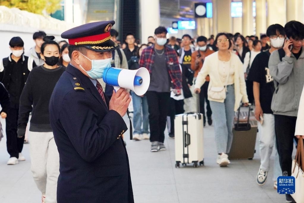 4月29日,淄博火車站工作人員在引導(dǎo)出站旅客。