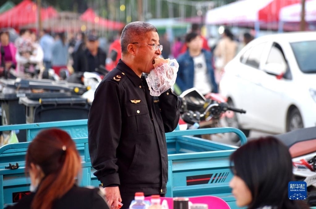 4月30日,在淄博市沂源縣悅莊鎮(zhèn)下龍巷村燒烤廣場,鎮(zhèn)市場監(jiān)督管理所的一名工作人員在值勤現(xiàn)場吃晚餐。
