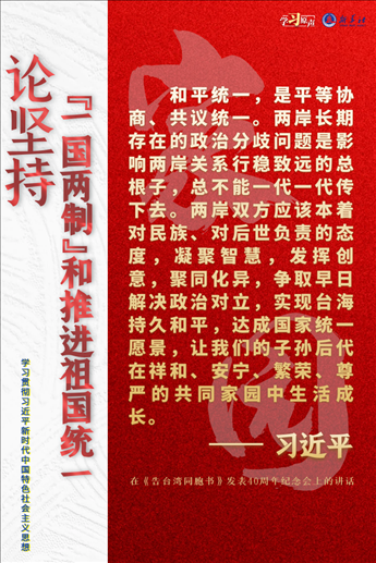 解決臺灣問題、實現(xiàn)祖國完全統(tǒng)一,是中國共產(chǎn)黨矢志不渝的歷史任務(wù),是全體中華兒女的共同愿望,是實現(xiàn)中華民族偉大復(fù)興的必然要求。必須堅持貫徹新時代黨解決臺灣問題的總體方略,牢牢把握兩岸關(guān)系主導(dǎo)權(quán)和主動權(quán),堅定不移推進祖國統(tǒng)一大業(yè)。