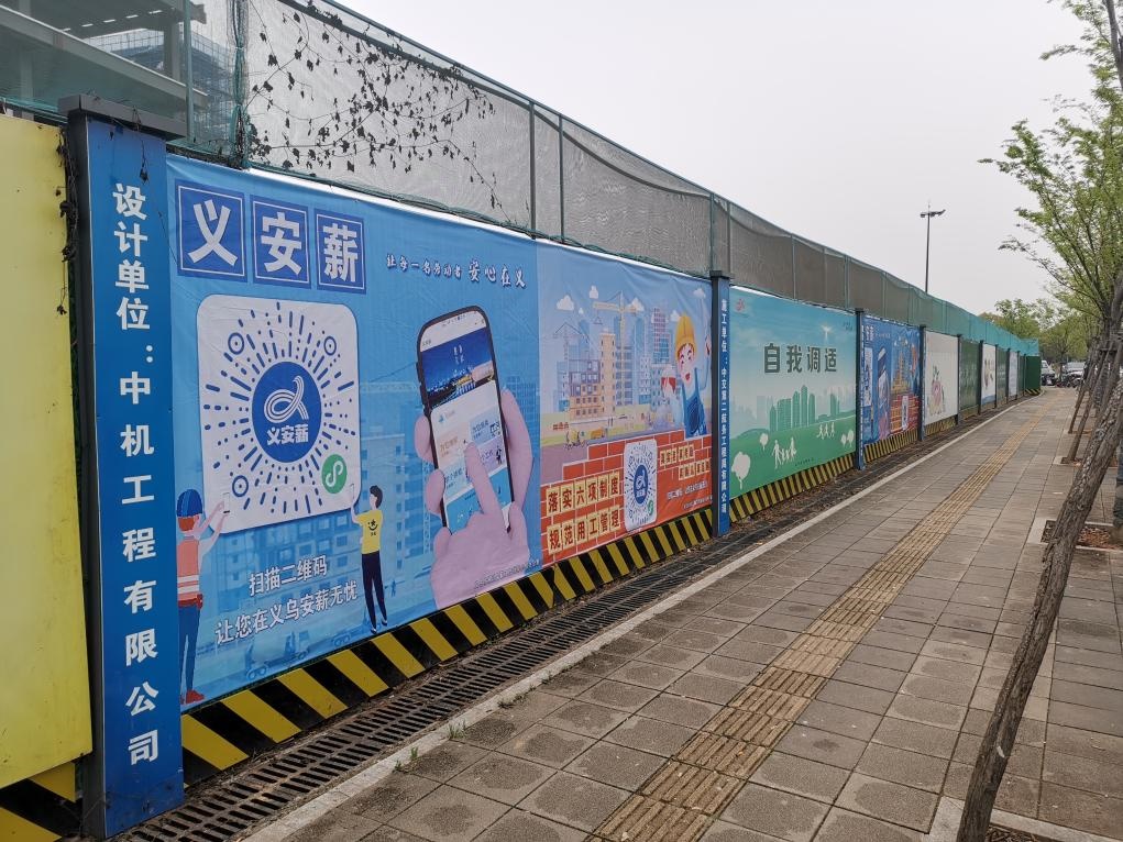 義烏市一在建工地圍擋上粘貼的“義安薪”勞資糾紛維權碼。(義烏市人社局供圖)