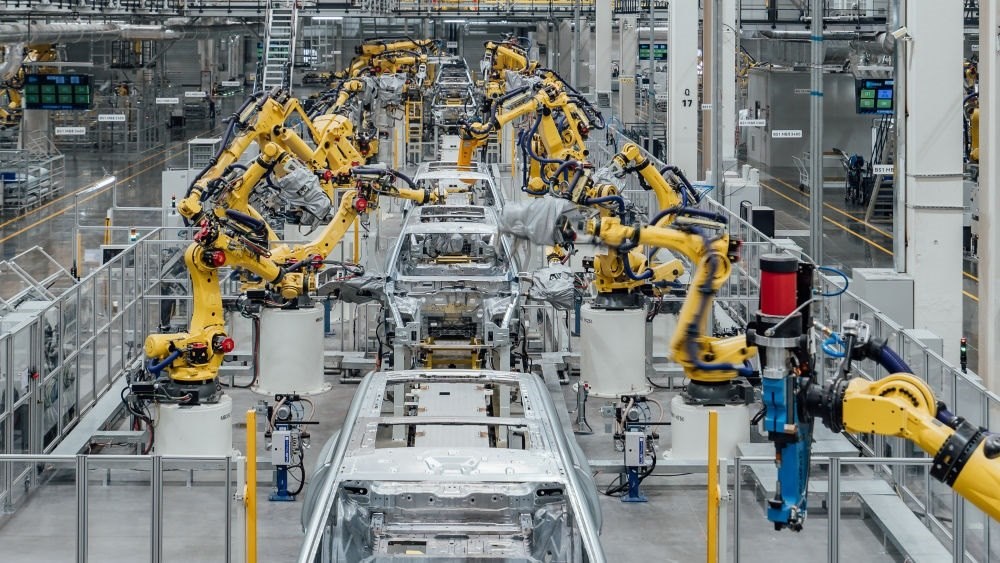這是在重慶市兩江新區(qū)拍攝的賽力斯汽車超級(jí)工廠焊裝車間生產(chǎn)線(2024年2月26日攝,無(wú)人機(jī)照片) 新華社發(fā)(高彰 攝)。