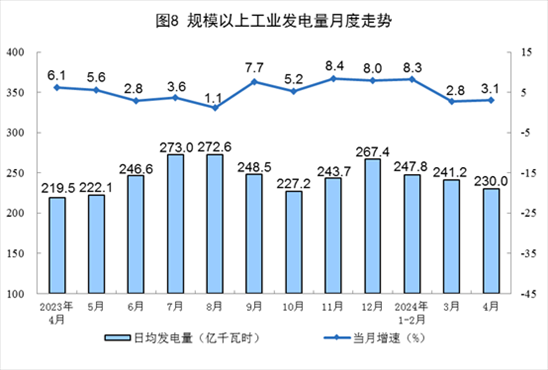分品種看,4月份,規(guī)上工業(yè)火電、水電、太陽能發(fā)電增速加快,核電由降轉(zhuǎn)增,風(fēng)電同比下降。其中,規(guī)上工業(yè)火電同比增長1.3%,增速比3月份加快0.8個(gè)百分點(diǎn);規(guī)上工業(yè)水電增長21.0%,增速比3月份加快17.9個(gè)百分點(diǎn);規(guī)上工業(yè)核電增長5.9%,3月份為下降4.8%;規(guī)上工業(yè)風(fēng)電下降8.4%,3月份為增長16.8%;規(guī)上工業(yè)太陽能發(fā)電增長21.4%,增速比3月份加快5.6個(gè)百分點(diǎn)。