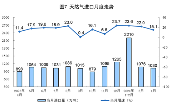 1—4月份,規(guī)上工業(yè)天然氣產(chǎn)量830億立方米,同比增長5.0%。進(jìn)口天然氣4300萬噸,同比增長20.7%。
