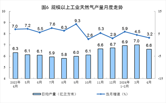 天然氣生產(chǎn)穩(wěn)定增長,進(jìn)口保持較快增長。4月份,規(guī)上工業(yè)天然氣產(chǎn)量198億立方米,同比增長3.2%,增速比3月份放緩1.3個(gè)百分點(diǎn);日均產(chǎn)量6.6億立方米。進(jìn)口天然氣1030萬噸,同比增長15.1%。