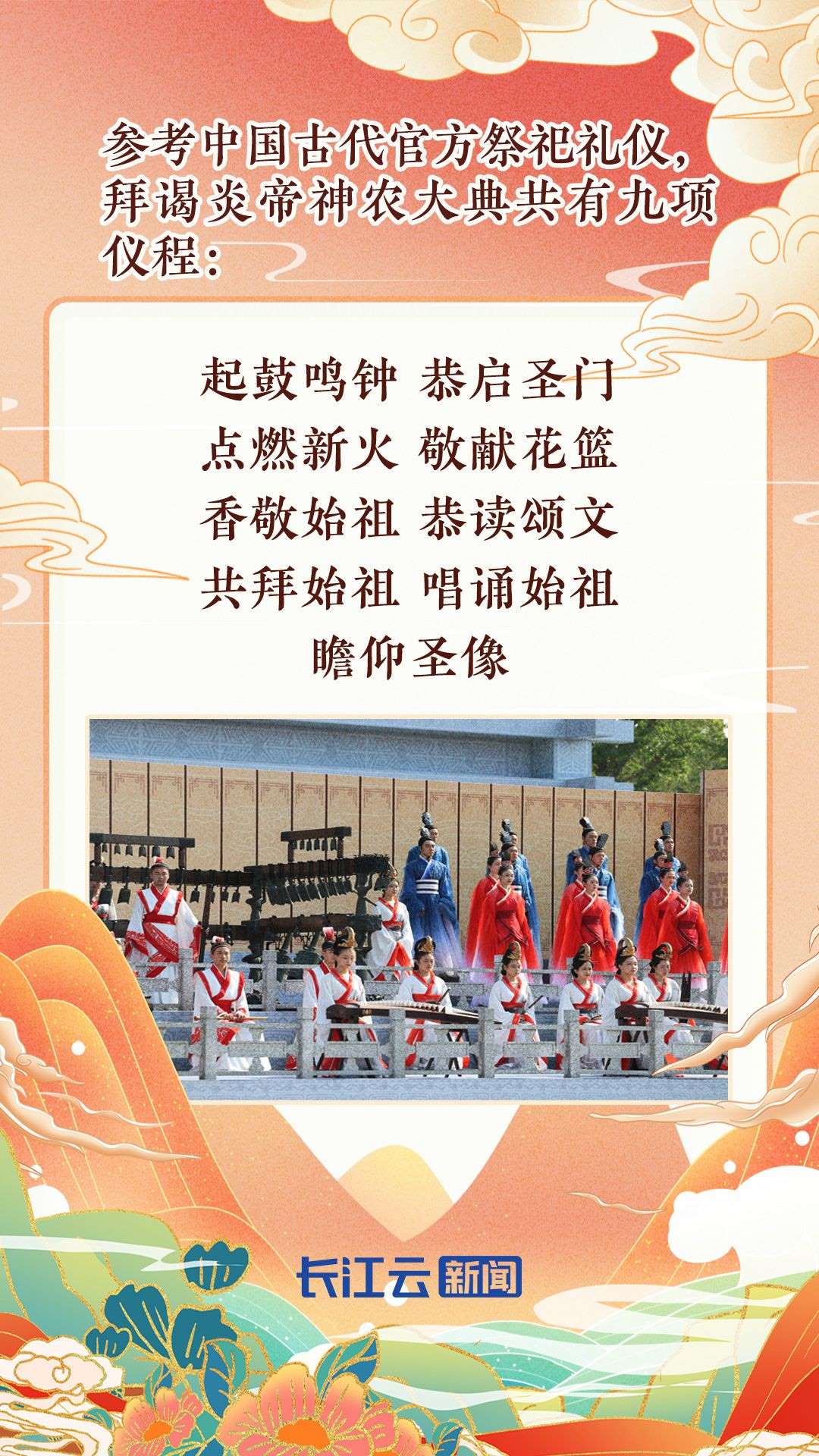 在儀式流程方面,設(shè)計有:起鼓鳴鐘、恭啟圣門、點燃新火、敬獻花籃、香敬始祖、恭讀頌文、共拜始祖、唱誦始祖、瞻仰圣像等九項儀程,充分融入了炎帝文化、荊楚文化、曾隨文化的元素;