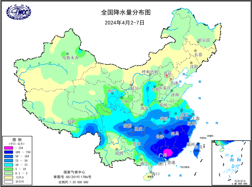 14次區(qū)域暴雨過程襲擊我國(guó),較常年同期明顯偏多。春季,我國(guó)共發(fā)生14次區(qū)域暴雨過程,較常年同期偏多3.8次。4月2-7日的暴雨過程為1961年以來同期第八強(qiáng),受其影響,我國(guó)華東南部、華中南部、華南東部及貴州東北部、重慶、四川中東部等地累計(jì)降水量50~100毫米,浙江西南部、福建、江西南部、湖南東南部、廣東大部等地累計(jì)降水量100~250毫米,局地超過250毫米(圖5);湖南茶陵(203.2毫米)、廣東始興(145.3毫米)日降水量超過極端閾值。