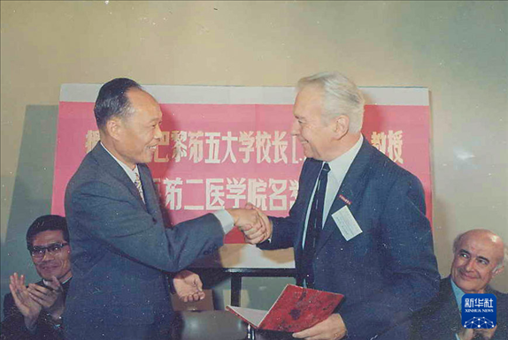 上海第二醫(yī)學院(現(xiàn)上海交通大學醫(yī)學院)校長王振義(前左)授予法國巴黎第五大學校長歐基埃名譽教授稱號(攝于1985年)。新華社發(fā)(上海交通大學醫(yī)學院供圖)