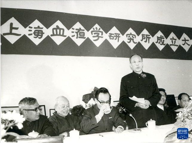 1987年3月23日,王振義(左四)參加上海血液學研究所揭牌儀式。新華社發(fā)(上海交通大學醫(yī)學院供圖)