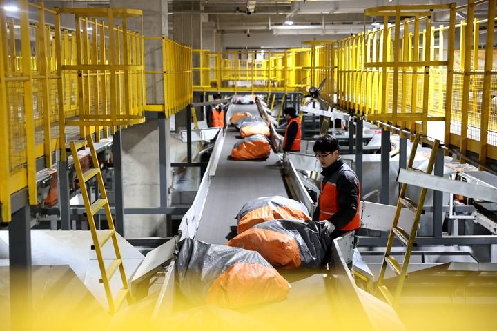 工人在河北省固安縣的申通快遞華北轉運中心內工作(2025年2月26日攝)。新華社記者 王曉 攝