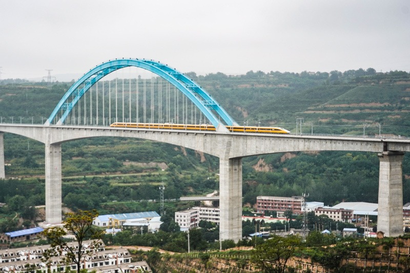 9月11日,聯(lián)調(diào)聯(lián)試綜合檢測列車駛過位于陜西省銅川市的西延高鐵王家河特大橋。