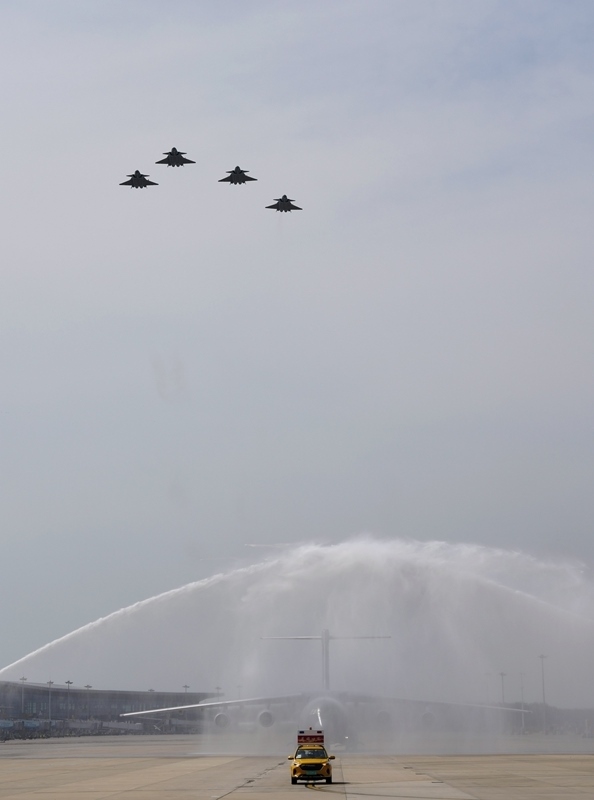 9月12日,第十二批在韓中國人民志愿軍烈士遺骸回國。這是在沈陽桃仙國際機場,接運烈士遺骸回國的運-20專機通過水門。