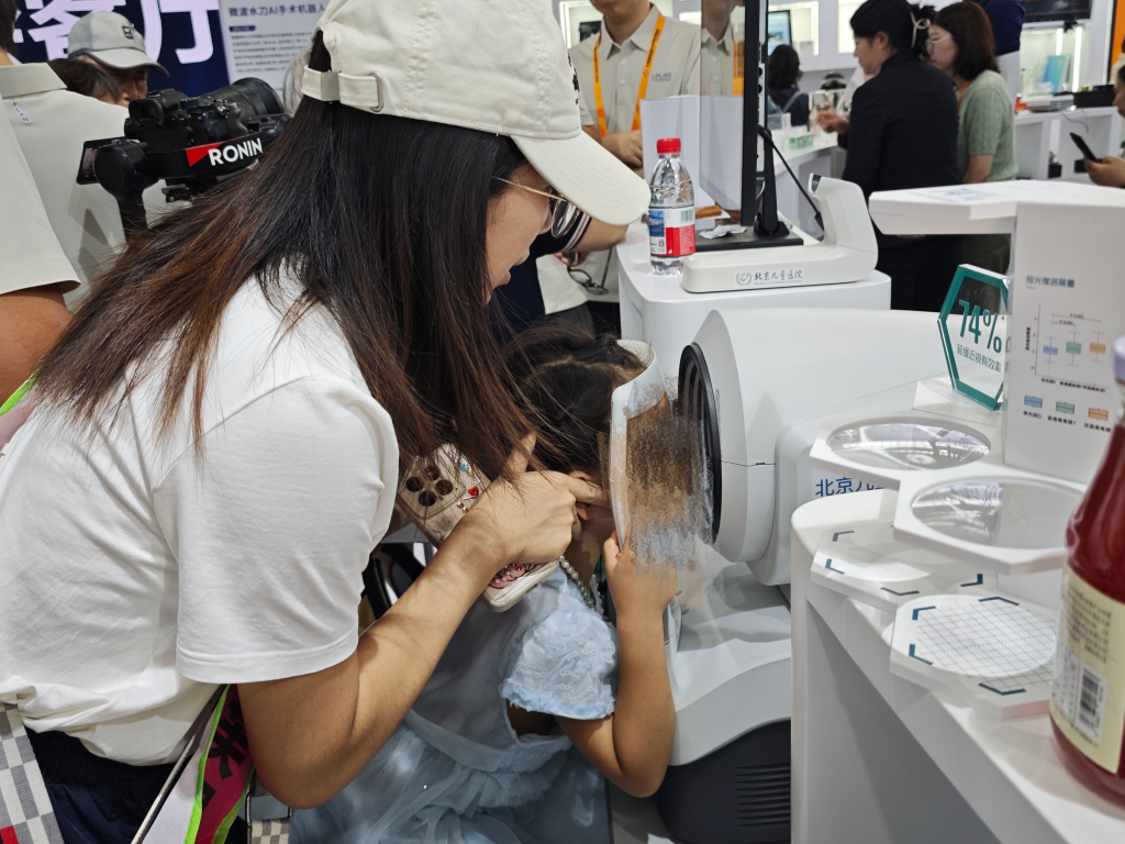 在2025年服貿(mào)會(huì)健康衛(wèi)生服務(wù)專題展,一位工作人員帶著小朋友體驗(yàn)智能屈光篩查儀。新華社記者 劉禎 攝