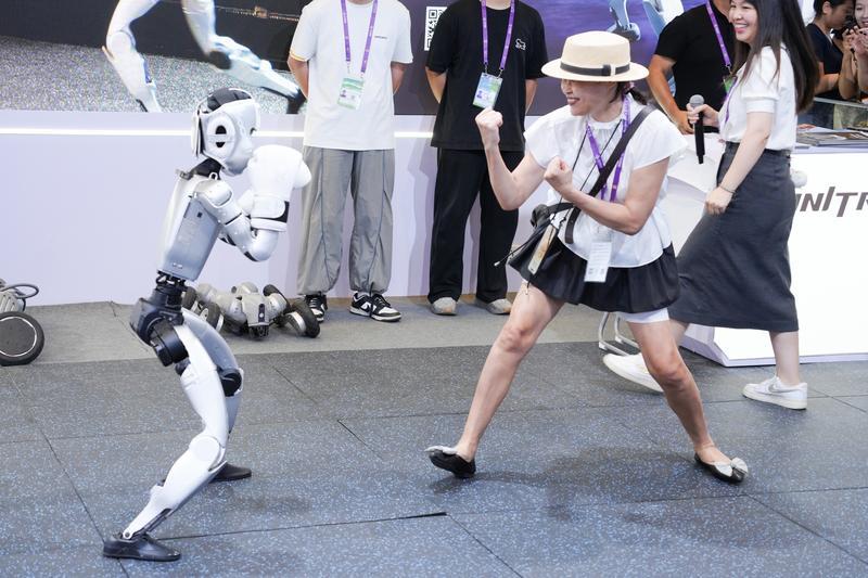2025年9月19日,在廣西南寧國際會(huì)展中心人工智能專館,一臺(tái)人形機(jī)器人和觀眾表演拳擊。新華社記者 周汀鷺 攝