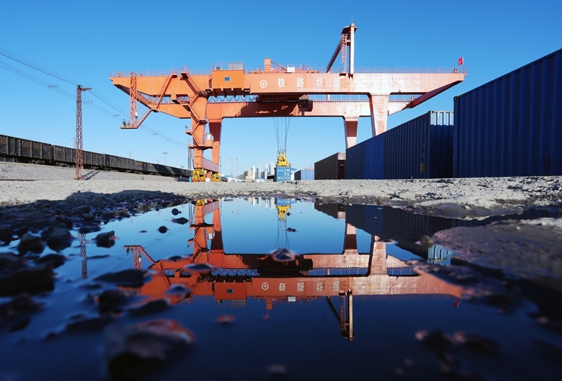 9月27日,在綏芬河站集裝箱換裝場(chǎng),龍門(mén)吊在對(duì)回程中歐班列進(jìn)行換裝作業(yè)。