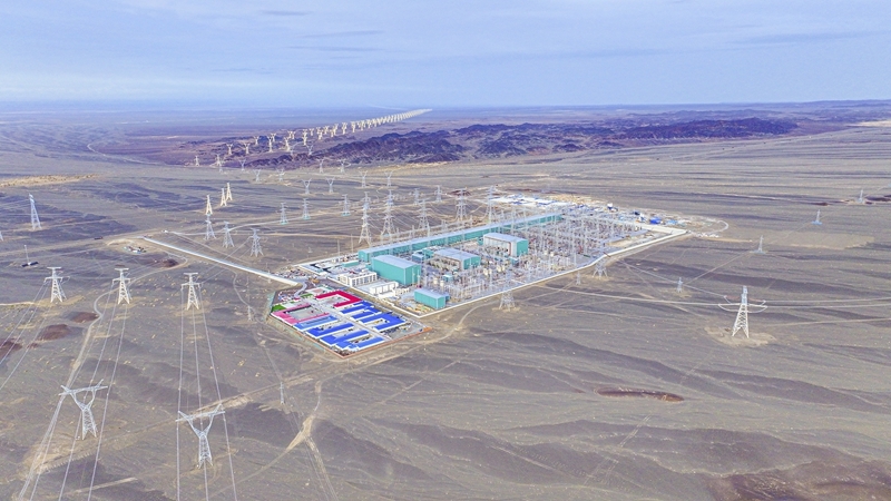 9月22日在新疆巴音郭楞蒙古自治州若羌縣拍攝的三峽集團(tuán)“疆電外送”第四通道電源項(xiàng)目施工現(xiàn)場(chǎng)(無人機(jī)照片)。