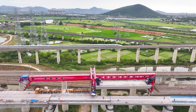 中鐵四局施工機(jī)械在巢馬城際鐵路最后一榀箱梁架設(shè)現(xiàn)場(chǎng)作業(yè)(7月8日攝,無人機(jī)照片)。