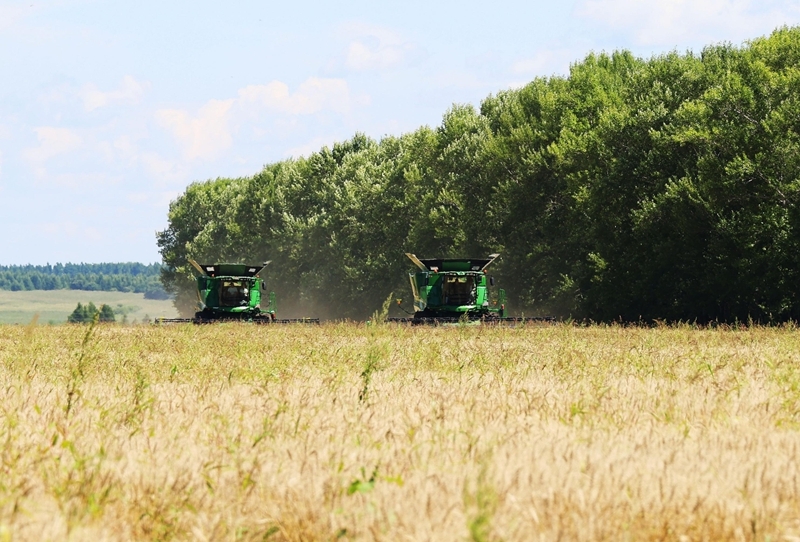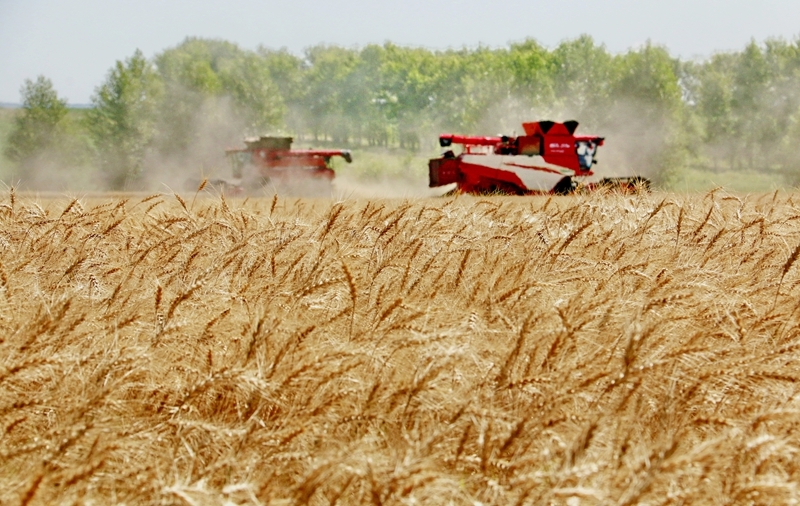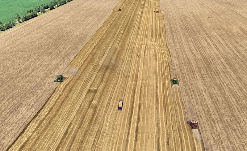 8月5日,位于黑龍江省五大連池市的大慶油田農(nóng)場(chǎng)調(diào)動(dòng)多臺(tái)聯(lián)合收割機(jī)搶收小麥。