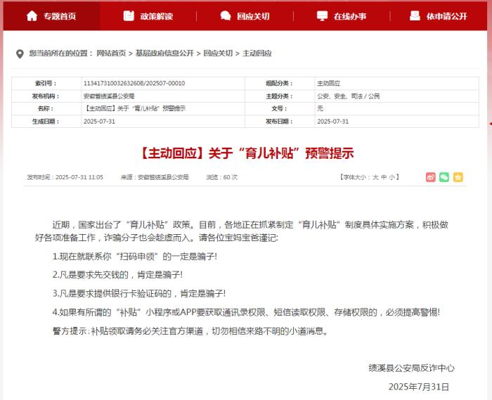 安徽績溪縣公安局7月31日發(fā)布關于育兒補貼的預警提示。