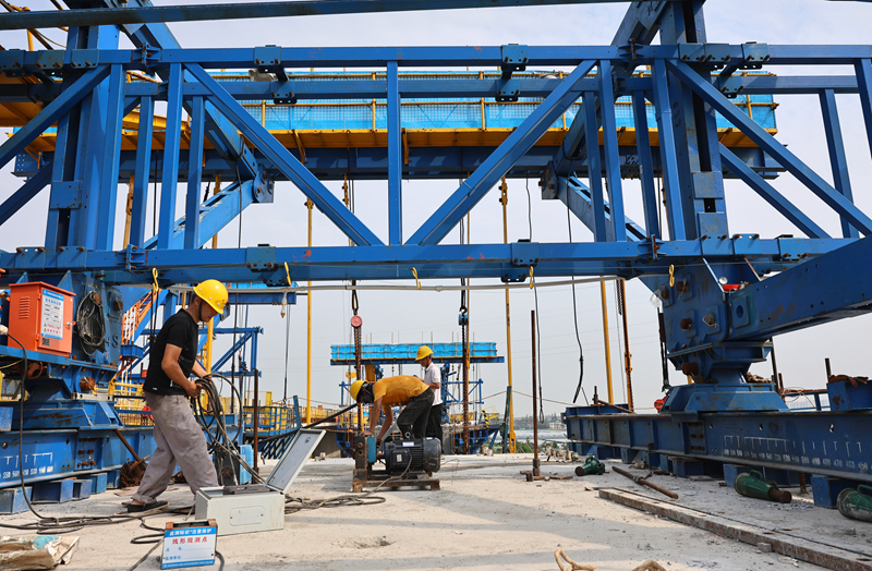 8月12日拍攝的滬寧合高鐵上海特大橋跨羅蘊(yùn)河連續(xù)梁施工現(xiàn)場(無人機(jī)照片)。