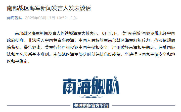 中國網(wǎng)8月13日訊 據(jù)“南海艦隊”微信公眾號消息,南部戰(zhàn)區(qū)海軍新聞發(fā)言人何鐵城海軍大校表示,8月13日,美“希金斯”號驅(qū)逐艦未經(jīng)中國政府批準,非法闖入中國黃巖島領(lǐng)海,中國人民解放軍南部戰(zhàn)區(qū)海軍組織兵力,依法依規(guī)跟蹤監(jiān)視、警告驅(qū)離。美軍行徑嚴重侵犯中國主權(quán)和安全,嚴重破壞南海和平穩(wěn)定,違反國際法和國際關(guān)系基本準則。南部戰(zhàn)區(qū)海軍部隊時刻保持高度戒備,堅決捍衛(wèi)國家主權(quán)安全和地區(qū)和平穩(wěn)定。