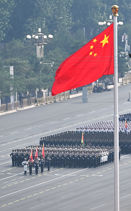 9月3日,紀念中國人民抗日戰(zhàn)爭暨世界反法西斯戰(zhàn)爭勝利80周年大會在北京隆重舉行。這是國旗護衛(wèi)隊在行進中。