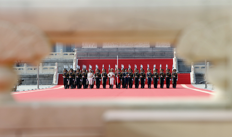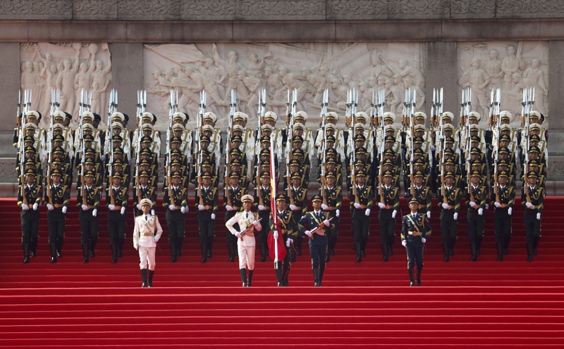 9月3日,紀念中國人民抗日戰(zhàn)爭暨世界反法西斯戰(zhàn)爭勝利80周年大會在北京隆重舉行。這是國旗護衛(wèi)隊從人民英雄紀念碑基座出發(fā),走向旗桿基座。