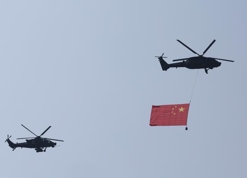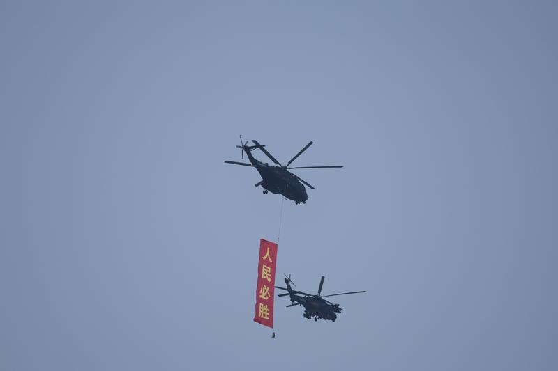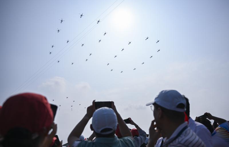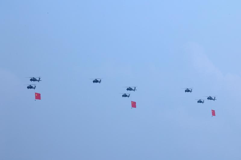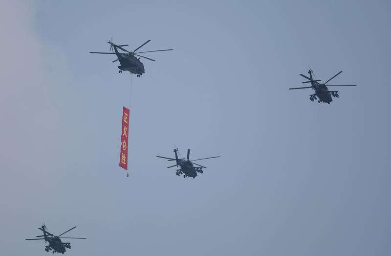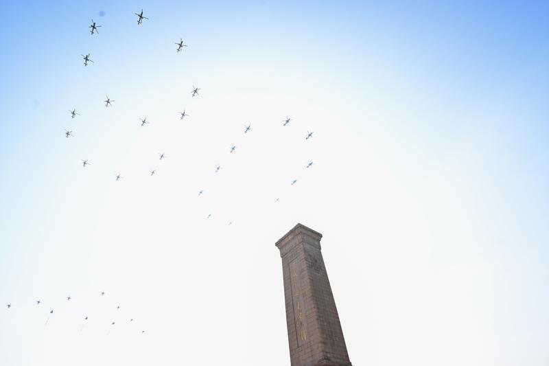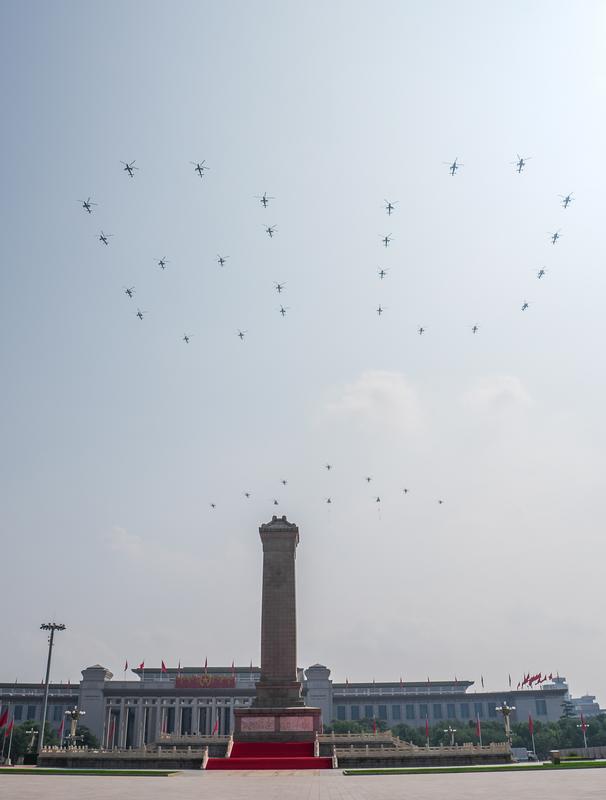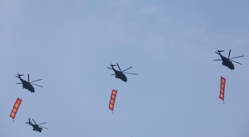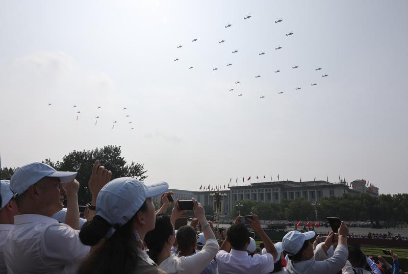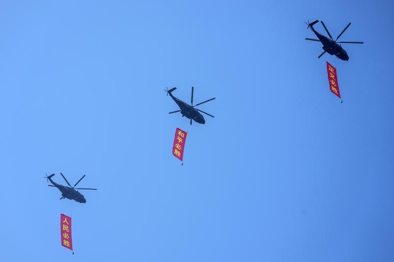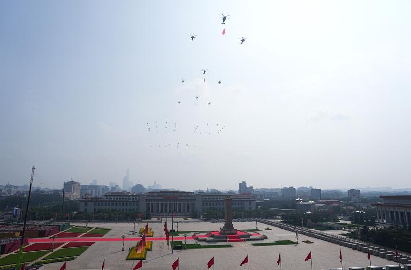 9月3日,紀(jì)念中國人民抗日戰(zhàn)爭暨世界反法西斯戰(zhàn)爭勝利80周年大會在北京隆重舉行。這是空中護(hù)旗梯隊飛過天安門廣場上空,26架直升機(jī)匯成巨大的“80”字樣。