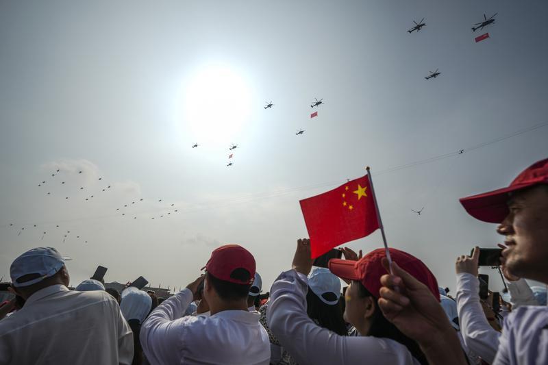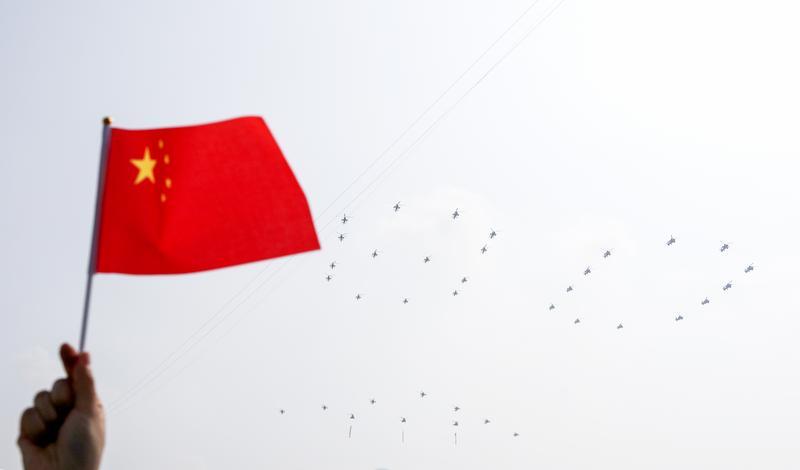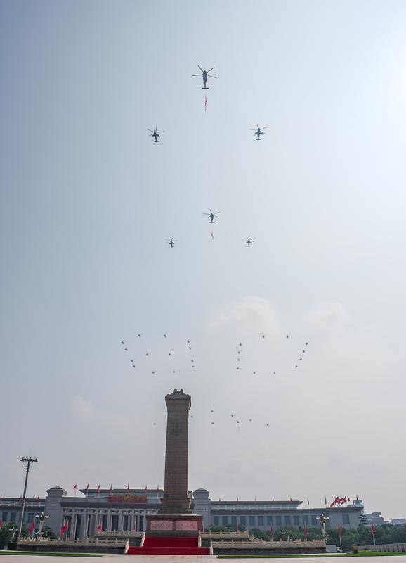 9月3日,紀(jì)念中國人民抗日戰(zhàn)爭暨世界反法西斯戰(zhàn)爭勝利80周年大會在北京隆重舉行。這是空中護(hù)旗梯隊。