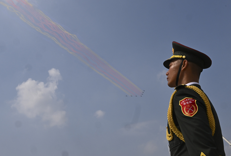 9月3日,紀(jì)念中國(guó)人民抗日戰(zhàn)爭(zhēng)暨世界反法西斯戰(zhàn)爭(zhēng)勝利80周年大會(huì)在北京隆重舉行。這是空中護(hù)旗梯隊(duì)。