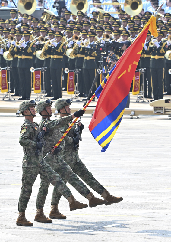 9月3日,紀(jì)念中國人民抗日戰(zhàn)爭暨世界反法西斯戰(zhàn)爭勝利80周年大會在北京隆重舉行。這是戰(zhàn)旗方隊接受檢閱。