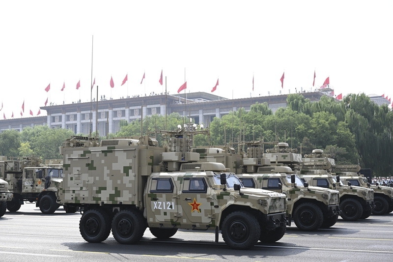 9月3日,紀(jì)念中國人民抗日戰(zhàn)爭暨世界反法西斯戰(zhàn)爭勝利80周年大會在北京隆重舉行。這是信息支援方隊接受檢閱。
