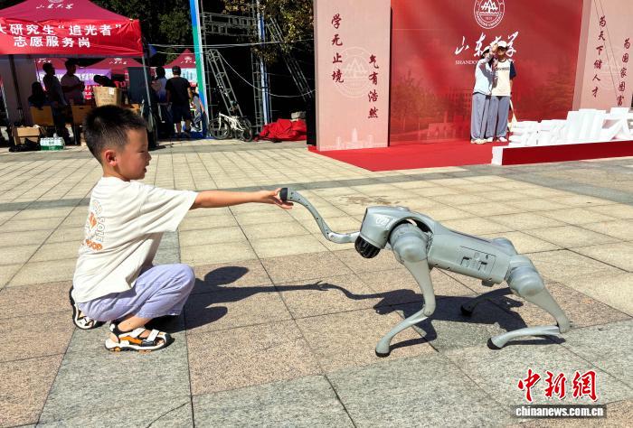 9月2日,山東濟南,一名小朋友在山東大學(xué)迎新現(xiàn)場和四足機器人握手。高藝芯 攝