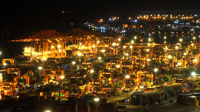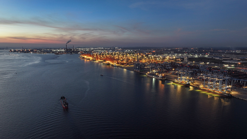 正在進(jìn)行晚間作業(yè)的欽州港碼頭(9月4日攝,無人機(jī)照片)。