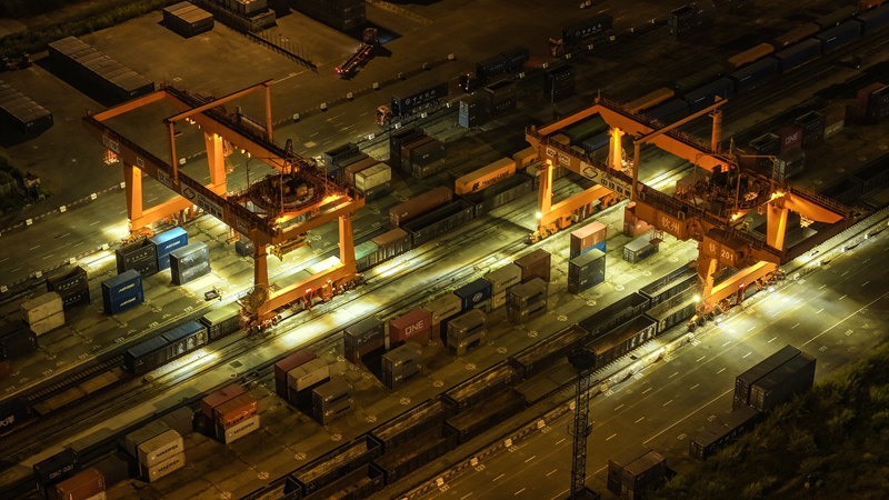 欽州鐵路集裝箱中心站塔吊在為貨列裝運(yùn)集裝箱(9月4日攝,無人機(jī)照片)。