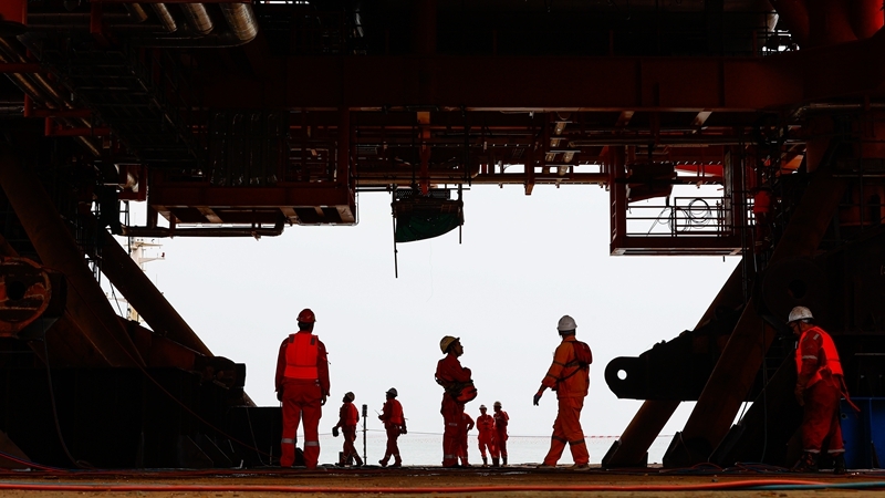 9月8日,工人在墾利6-1油田10-1北區(qū)塊Ⅱ期開(kāi)發(fā)項(xiàng)目油氣平臺(tái)安裝作業(yè)現(xiàn)場(chǎng)施工。