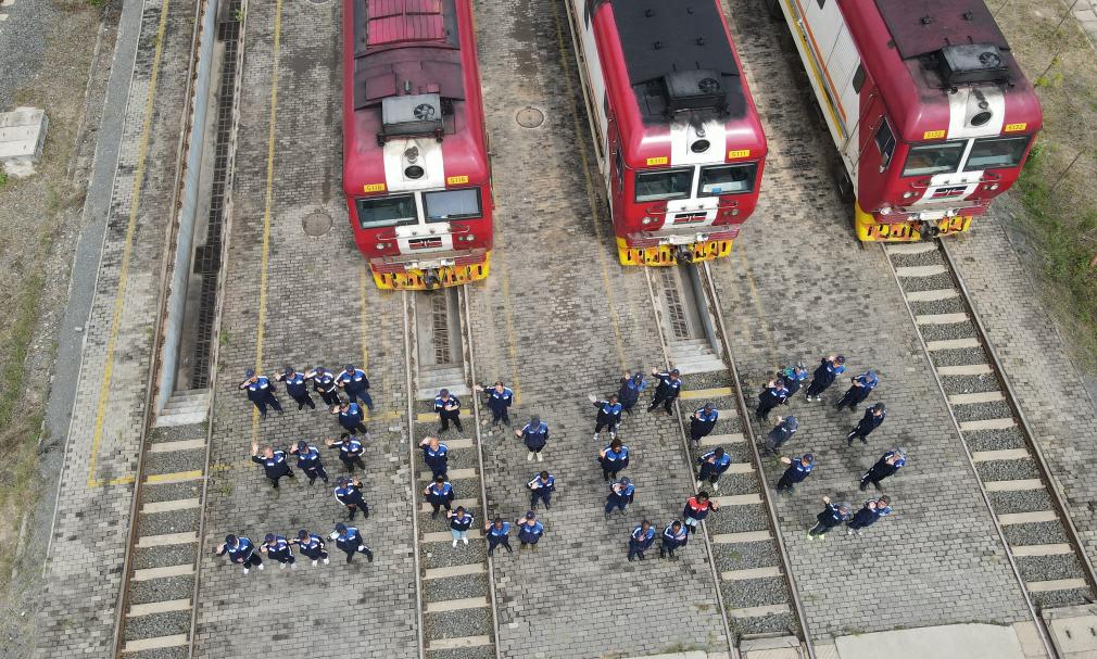 2025年8月19日,在肯尼亞內羅畢非洲之星鐵路運營有限責任公司機務運轉整備場,中肯兩國鐵路工作者在機車前站列并組成“3000”字樣,以紀念蒙內鐵路實現安全運營3000天(無人機照片)。新華社記者 楊光 攝