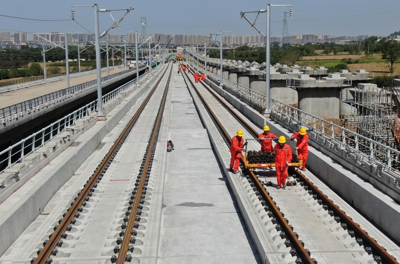 9月8日,施工人員在西十高鐵西安東至藍(lán)田區(qū)間鋪設(shè)無縫鋼軌(無人機(jī)照片)。